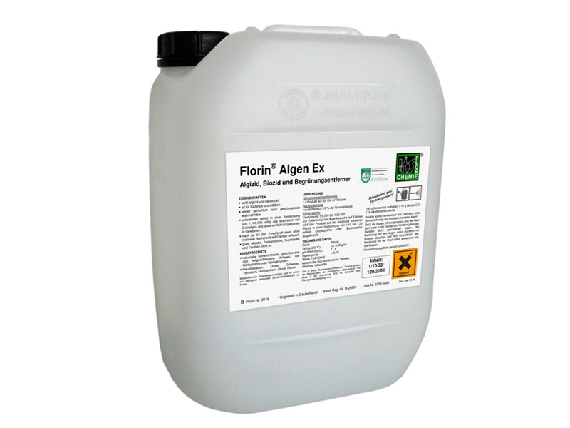 ist ein hoch effizientes, für den Badenden unbedenkliches und nicht wahrnehmbares Algizid. Seine absolut schaumfreie Formulierung beugt hierbei nicht nur Algenbefall langanhaltend vor, sondern wirkt auch klärend. Sein breites Wirkspektrum sowie sein großer Temperatur-, Wasserhärte und pH-Bereich machen dieses Produkt sehr vielseitig. Im Vergleich zu anderen bioziden Produkten zeichnet sich Florin Algen EX BT durch eine äußerst geringe orale und dermale Toxizität aus. Geringe Mengen des Produktes sollten wöchentlich oder nach starken Regenfällen nachgegeben werden.