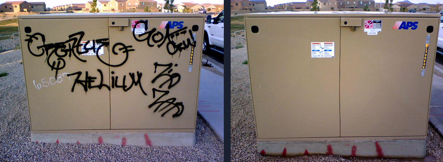 Auf lackierten Flächen Graffitiverschmutzungen in mehreren Schritten abtragen und nur so lange einwirken lassen, dass nur die Graffitis angelöst werden.